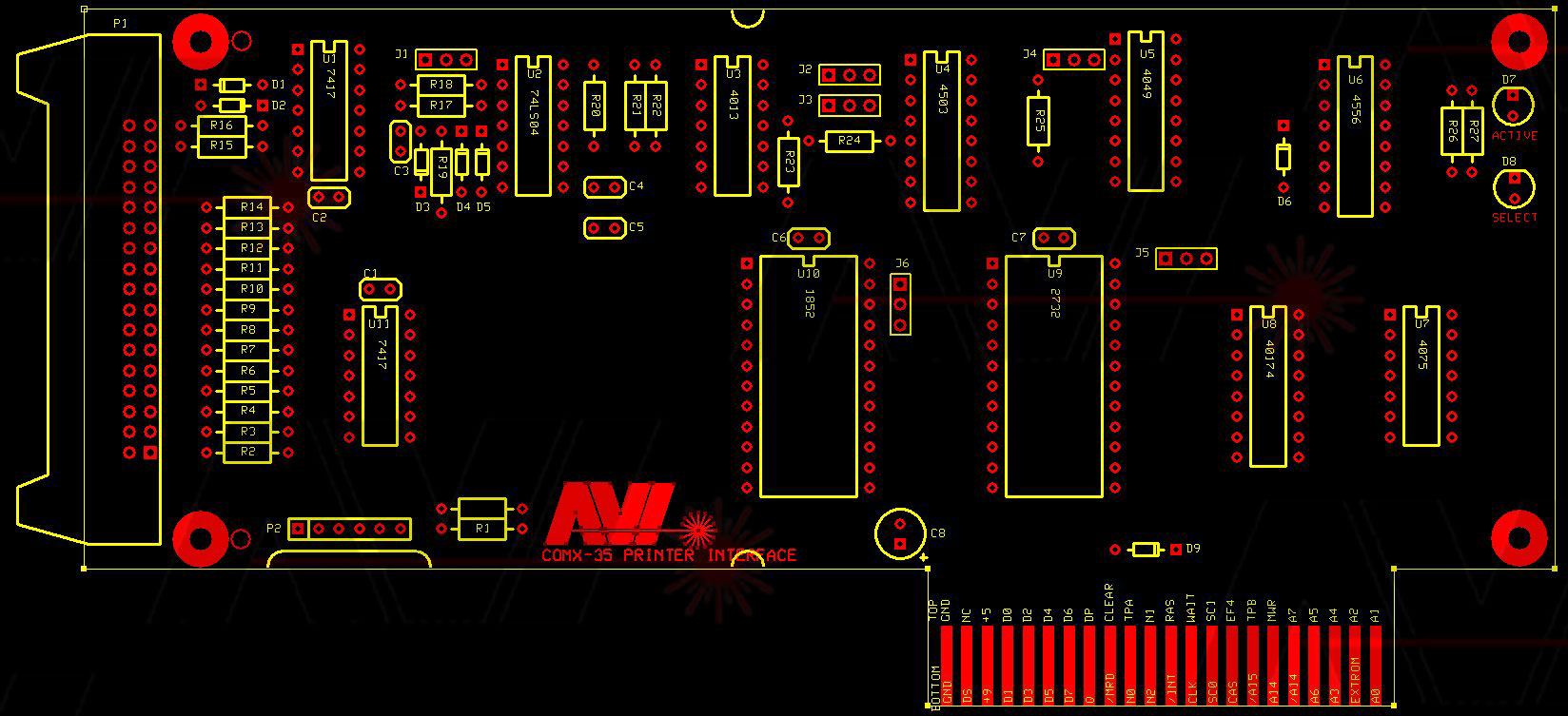 I tried to make it as close to the same layout as the original printer card. I made a couple of changes though. I used an AT28C256 EEPROM in place of the 2732 EPROM. I replaced the IDC-34 connector with a DB-25. This is fine for my board since it will never be put in a plastic case. The DB-25 is too tall to fit in a normal COMX expansion board case.