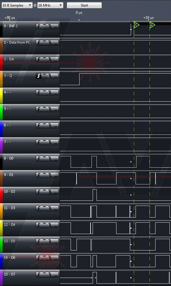 I used the markers in the logic analyzer software, and see some junk on the data bus right after the INP2 (first trace).